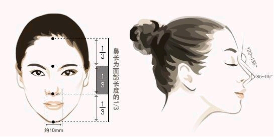 脸中鼻子所占的比率是:把脸竖直分为5份,鼻子占其中的1/5左右;水平分为3部分,鼻子占其中的1/3左右,(常说的三庭五眼)为理想的形态。