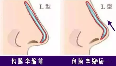 包膜的挛缩就会造成硅胶假体的挤压变短,而L型假体的形状鼻梁部位和鼻尖部位是连在一起的,这时候假体遭到包膜的挤压不仅鼻子会变短,连带着鼻尖也会上翘变成朝天鼻。
