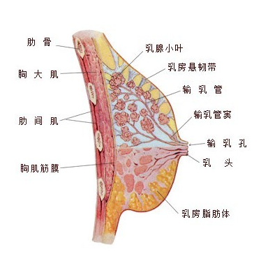 乳房主要由乳腺和脂肪构成。乳房内的结缔组织呈囊状包于乳腺周围,称脂肪囊,由于每个人的发育不同而有差别,脂肪的多少是决定乳房大小的重要因素之一。乳腺被完整地包裹在浅筋膜的浅、深层之间。乳腺叶间有许多不同走向的结缔组织纤维束,由腺体基底部连于皮肤或胸部浅筋膜,称乳房悬韧带,也称Cooper韧带,它们将皮肤深层与乳腺表面的浅筋膜相连,使皮肤固定于深部、乳头固定于乳房上,它们对乳腺起固定和悬吊作用,并使乳房在胸前有一定的活动性,直立时乳房不致下垂。但当结缔组织和皮肤的弹力纤维减弱并伸长时,乳房则出现下垂现象。