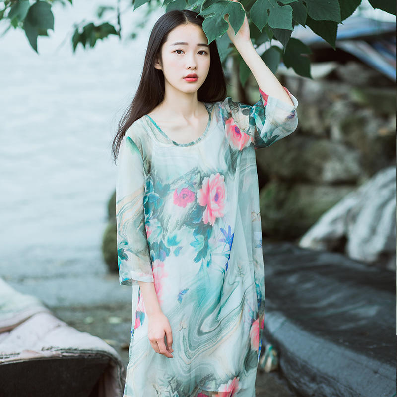 复古印花连衣裙,仿真丝雪纺,细腻飘逸,轻盈得很,风一般的触感。 浸染的国画牡丹,做了水性印花,晕染的细腻笔触,好一幅诗情画意的牡丹。