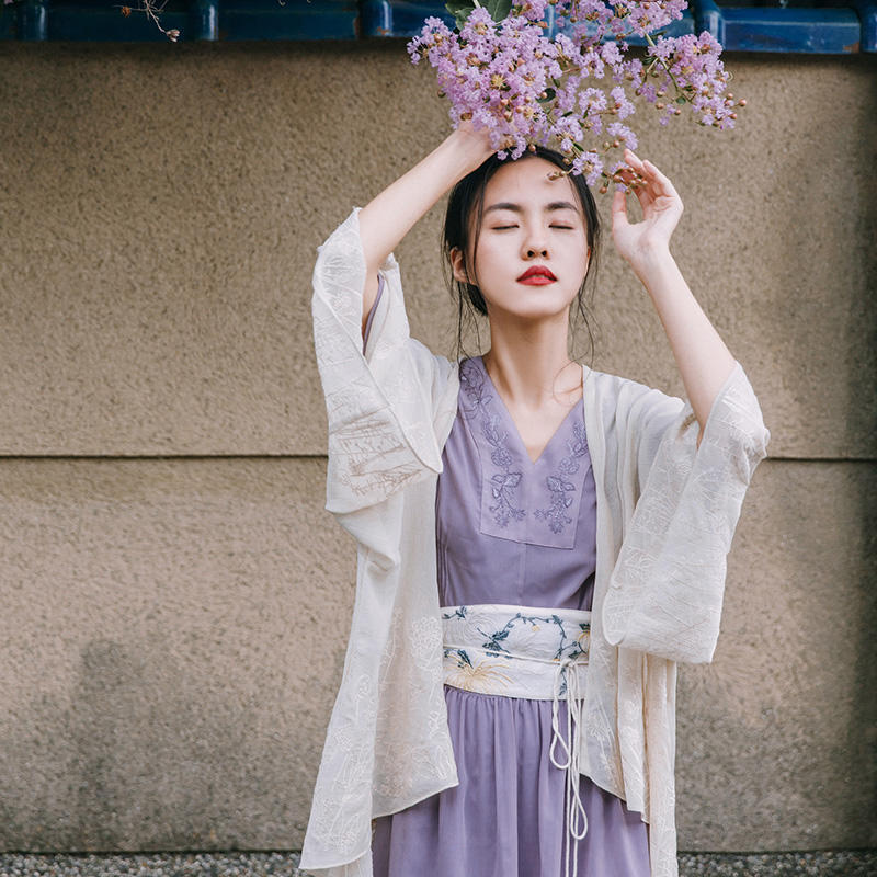《白玛》防晒开衫,淡淡的素色搭配改良汉服版型使其更加偏向古典的国风韵味。飘飘然的带肌理的褶皱布料,手感光滑、轻薄垂顺,披在身上好似一层薄纱。衣身长度适中,适合各种身高穿着。