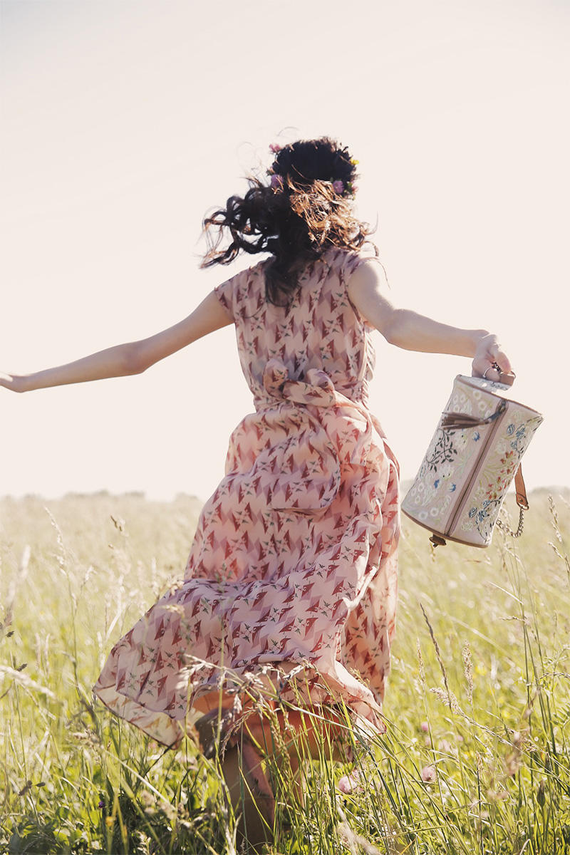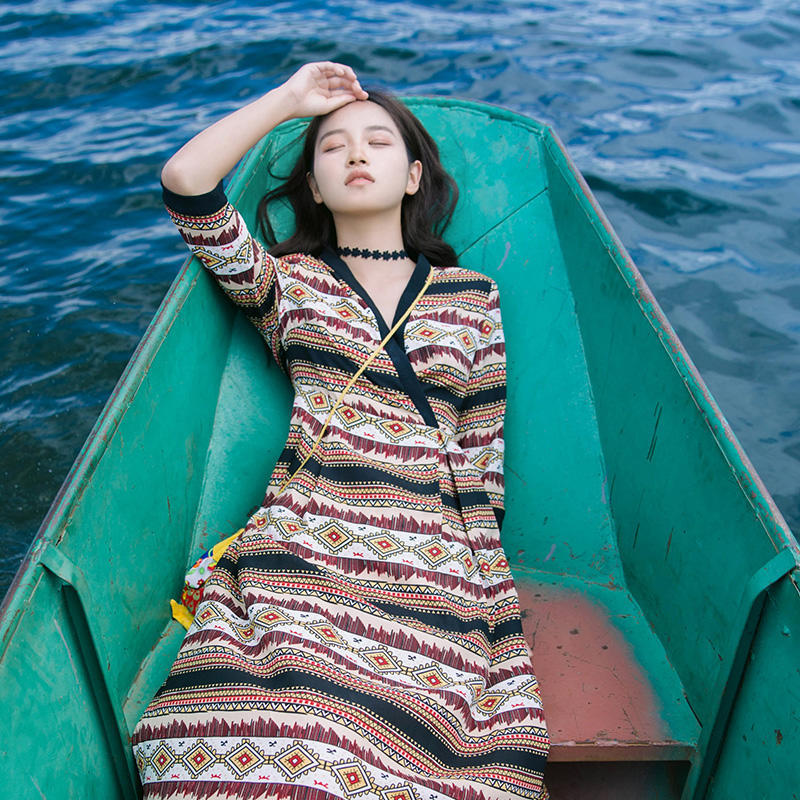 《山丘》连衣裙,交叉V领民族印花,复古轻盈,这样的一款裙袍,是温暖过往回忆里花繁怒放的相遇相伴。