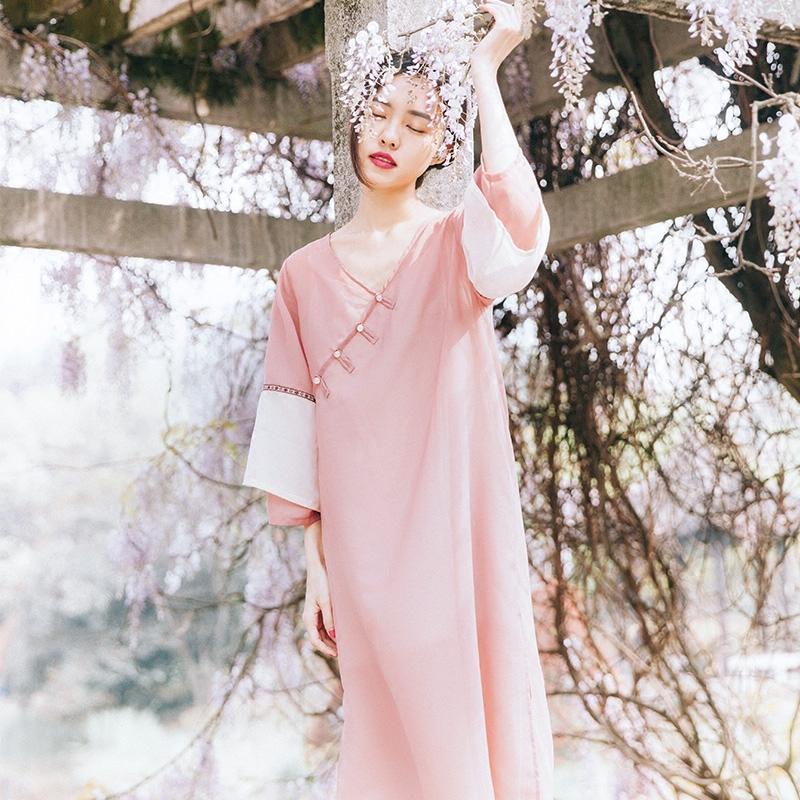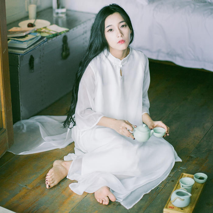 中式中长款连衣裙,半透天丝面料,内层凉爽有垂性细腻柔滑亲肤,简洁的小圆领加了相称的盘扣所独有的优雅文艺气息。清澈而潋滟的裙袍,似有淡淡的的香气。
