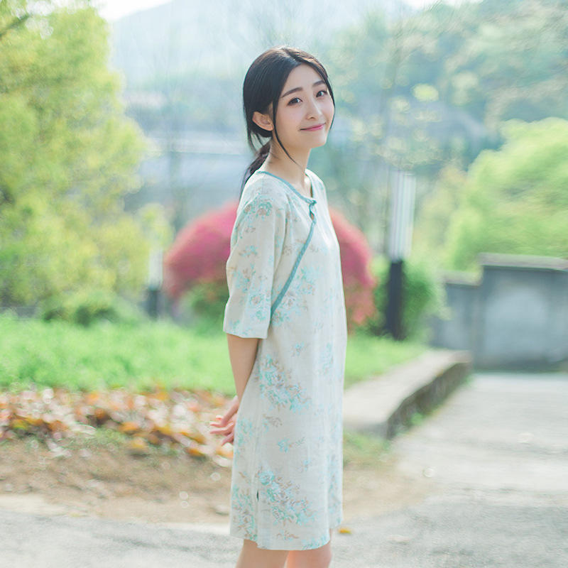 中式中长裙,用棉麻料子做了这件旗袍式的连衣裙,讲一个简单又平淡的故事。干净的米白色和清新的绿色,细腻的碎花点缀增添了些许温情。简洁圆领,领口一粒盘扣,带着古色古香中式味道。领口、门襟做了细致的包边,平添了一抹清新的绿。