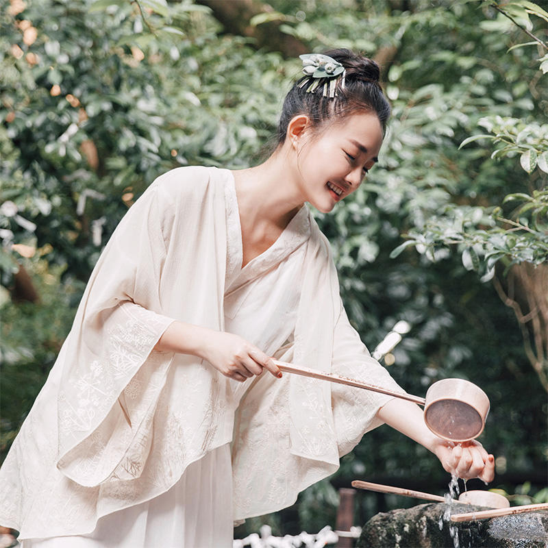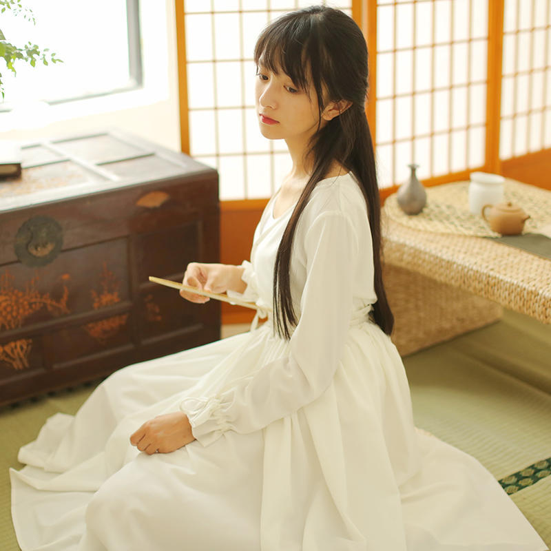 改良汉服束腰长裙,飘逸順滑通透。复合丝垂顺透气,两侧有束腰抽带,两侧打结有日式和风范缠绕打结古典汉服范,透露着中式禅意味道。