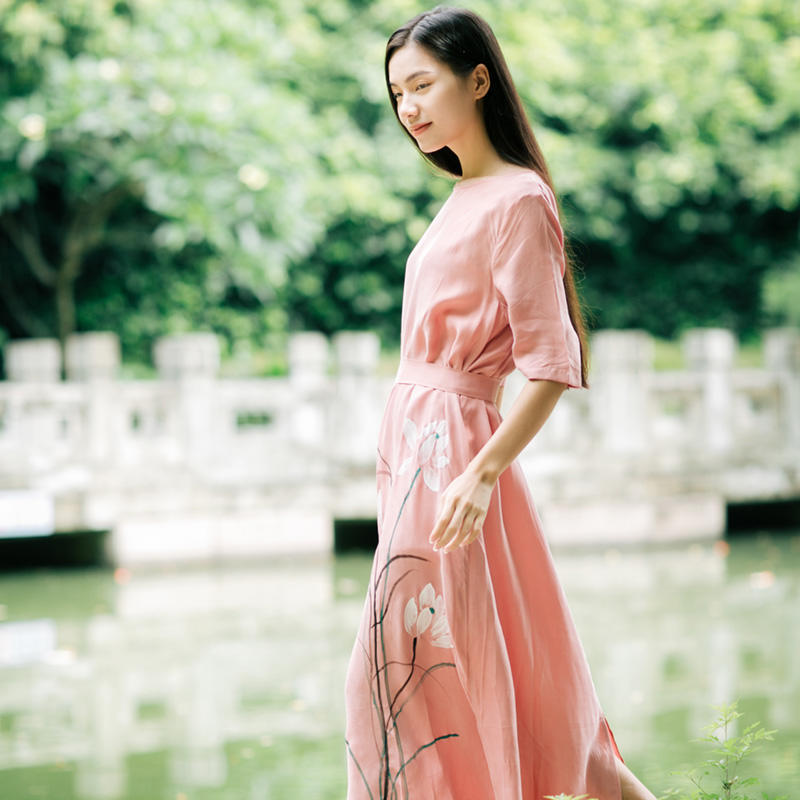束起的婉约,散开的不羁,一条裙子的两个秉性。温婉如玉的柔粉色,上面绘制一束小荷。天然材质,顺滑的手感,飘逸和垂感,易打理。