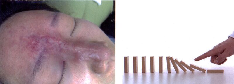 在玻尿酸栓塞点出现顺流转移现象的同时,出现逆流方向的皮损,常呈多个方向大面积的扩散。
