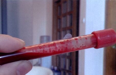 这是一个比较简单的实验,在普通的检验试管内新抽的全血中加入少量玻尿酸(某双相产品), 稍作摇晃,即可见试管壁上附着的玻尿酸颗粒,如果这些顆粒是附着在血管内壁上,也许会启动内源性凝血过程,而原本以为会出现的玻尿酸颗粒吸水膨胀并与血细胞紧密结合加速凝血的现象倒是未见