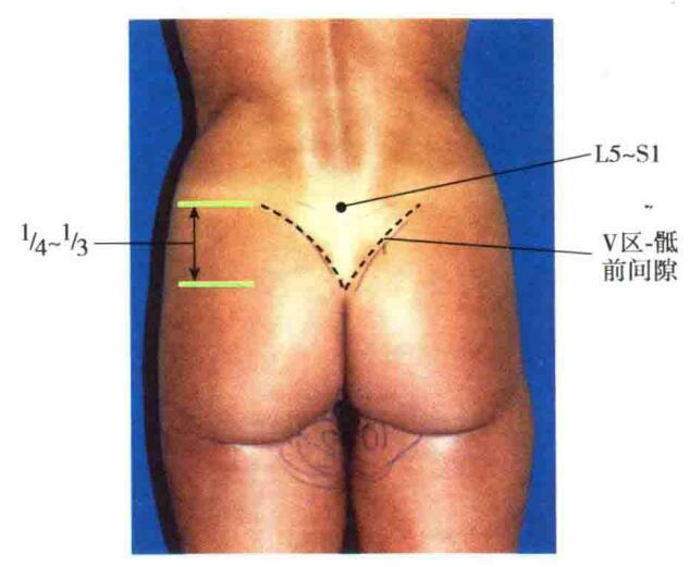 内侧臀-骶骨间隙应界限清晰,形成的v形;这个靠下的骶前间隙被称为v区是合适的随着V区变得更,臀部会有更大的美学吸引力。