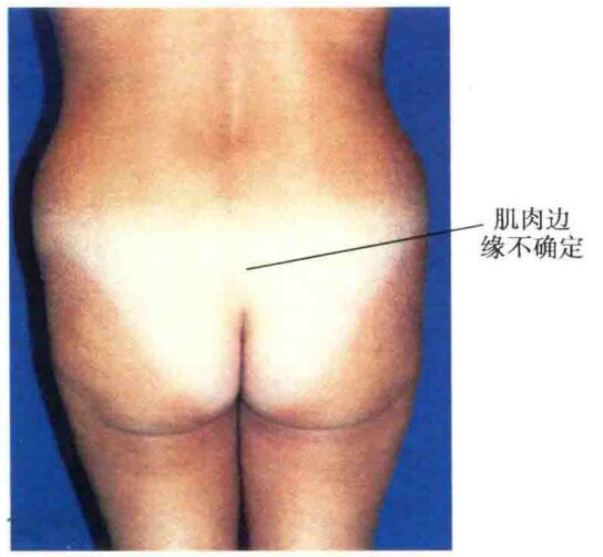 在理想的臀部中,臀肌的边缘界限应明确,有一个半圆形的向L转弯.上边缘应在臀间沟上方1/4?1/3处到达顶点。