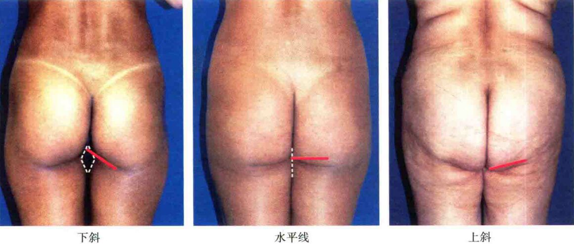 如果骶前间隙的长度为臀间沟的两倍(2:1)(左),臀沟会表现得极短,造成一个被削短的、平坦的、未充分发育臀部的错觉。如果骶前间隙长度小于臀间沟长度1/4,并且在下内侧臀区有多余的丰满度时,这会使臀沟显得过长,很异常的外观(中)。但是,即使有这样的关系,如果臀部的组织量充分,特别是下三分之一,整体的表现可能也是充分的(右)。