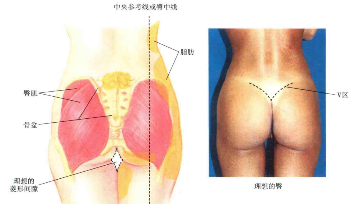 臀大肌起点的上半部在确定理想的臀部中起重要作用。但是,臀部美学不完全依赖臀肌。臀部的整体形状还受骨盆解剖和脂肪分布的影响,如果有松弛或悬垂的话,小部分受皮肤影响,如体重大量减少的患者中所见。毫无疑问,对形状重要的贡献者是脂肪。骶骨、上臀部、侧腰和腿外侧的多余脂肪会扭曲形状和轮廓。