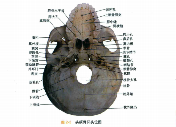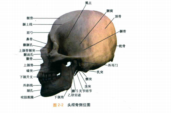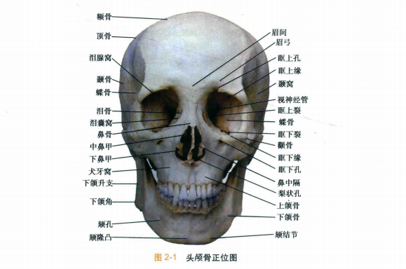 颅由23块形状和大小不一的扁骨和不规则骨组成,除了下颌骨外,各骨之间相互连接, 成头面部的框架(图2-1至图2-3) 。解剖学上将围成颅腔的颅骨称为脑颅骨,而将围成眶腔、 鼻腔和口腔的颅骨称为面颅骨。 其中与面部轮廓相关的颅骨主要包括属于面颅骨的额骨、上颌骨、鼻骨、下颌骨以及属于脑颅骨的额骨和颞骨。