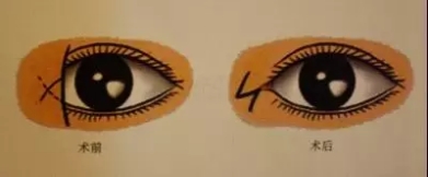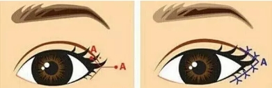 双眼皮+开眼角=美丽大眼 双眼皮可以达到眼睛变大的效果,但这也只是正常没有蒙古褶的眼睛,如果有内眼角皮肤遮盖的情况,则要一同开内眼角才能达到更好的效果。 开眼角手术(一般都开内眼角)是在内眼角部位设计合适的切口,将内眼角多余的赘皮切除,缝合在如图虚线位置,将内眼角往鼻部迁移,使深藏的粉红色泪阜展现,从而拉长眼眶的范围。
