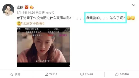 近新剧正在热播的戚薇大周末的突然搞了事情,因为网友diss她的双眼皮贴丑,发文回应称“老子这辈子也没贴过双眼皮贴”,并公开承认自己割了双眼皮