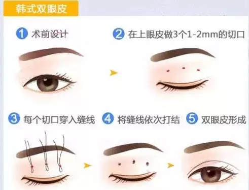 微创双眼皮也叫做“韩式三点”,是通过切开三点、去除适量脂肪和眼轮匝肌将层与睑板进行多点缝合而形成双眼皮。
