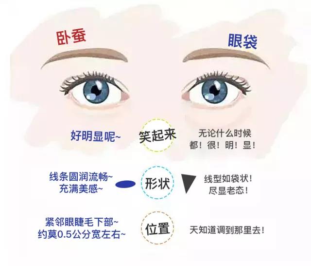 2、“卧蚕”在笑起来时更,能让眼睛变大变美,而眼袋只会在笑起来的时候加深,让人更显老。