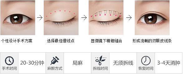 特点:不用开刀、恢复时间短,无疤痕的双眼皮方法。