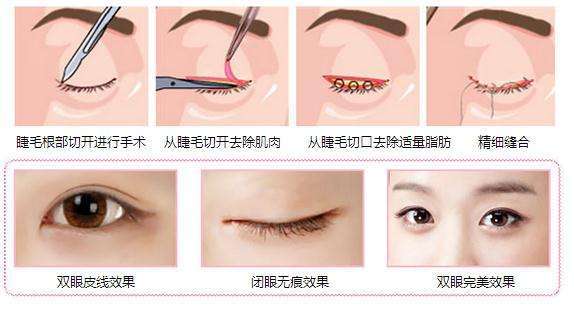 通过手术在上眼皮处作一切口,去除多余的皮肤及脂肪组织,然后将眼睑皮肤固定在所需高度的睑板上形成重睑。