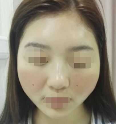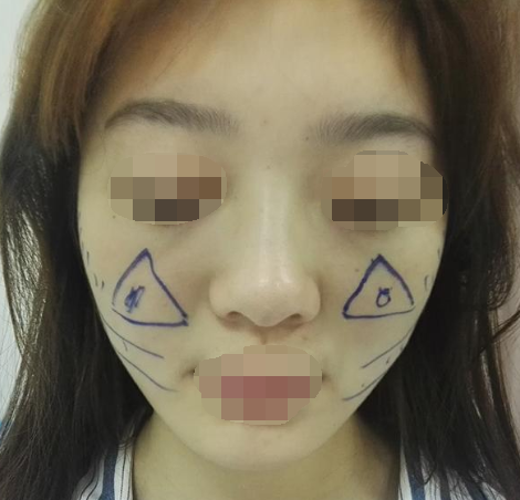 术前照片,妹子的基础情况还是比较不错,就是苹果肌不够,所以选择自体脂肪填充苹果肌改善