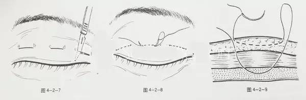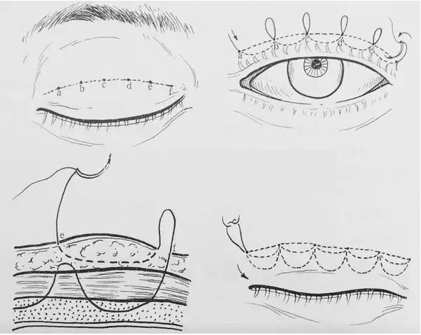从a至f点缝合,深度穿过睑板或其上方的上睑提肌腱膜,从f点至a点缝合,深度通过皮下和层。