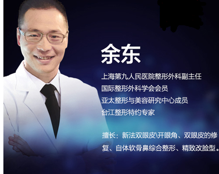 余东,男,博士后,整形博士、现上海交通大学医学院附属第九人民医院科主任医师,10多年专业整形美容工作,具备上万例的手术经验,在美国杂志上发表中国人的第一篇下颌角整形文章。2003年-2006年中国协和医科大学中国医学科学院整形博士毕业,2006-2008年上海交通大学医学院附属第九人民医院博士后出站。擅长:新法双眼皮\开眼角;双眼皮的修复;磨骨改脸型,下颌角缩小,颧骨整形,眼眶整形,尖嘴畸形.鼻头缩小,鼻根收窄,自体软骨整形。