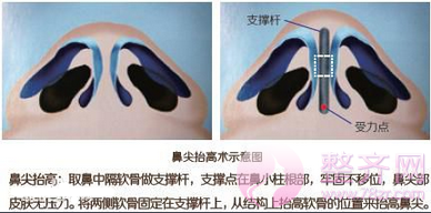 要矫正鼻尖部形态,的选择是用自体软骨对鼻尖部软骨支架进行重建,鼻尖部软骨处于悬空状态,支撑力差,在鼻尖部软骨上垫假体就像要在沙土上建房子,对鼻尖的改善很有限,甚至破坏鼻尖部原有的形态。正确的方法是在鼻翼软骨间插入用鼻中隔软骨做的“支撑杆”(两个鼻孔中间有一个隔断,内有一块软骨叫鼻中隔软骨,鼻中隔软骨比较平直,可以做成“支撑杆”,使鼻尖能直线方向的抬高与延长),支撑杆上段和鼻翼软骨缝合,下端顶在上颌骨上,给予鼻翼软骨强有力的支撑,使鼻尖部软骨框架抬高。优点是:①不但鼻尖抬高了,鼻孔的形态也由原来的圆形变成漂亮的水滴形;②受力点在上颌骨上而不是在鼻尖部皮肤上,没有顶破鼻尖皮肤的危险;③植入的自体软骨和周围组织融合为一体就像钢筋和水泥结合成混凝土一样,皮肤和软骨间没有相对运动,不会对鼻尖皮肤形成摩擦,绝无皮肤破溃的危险,无后顾之忧,而且形成的鼻头宛若天生。