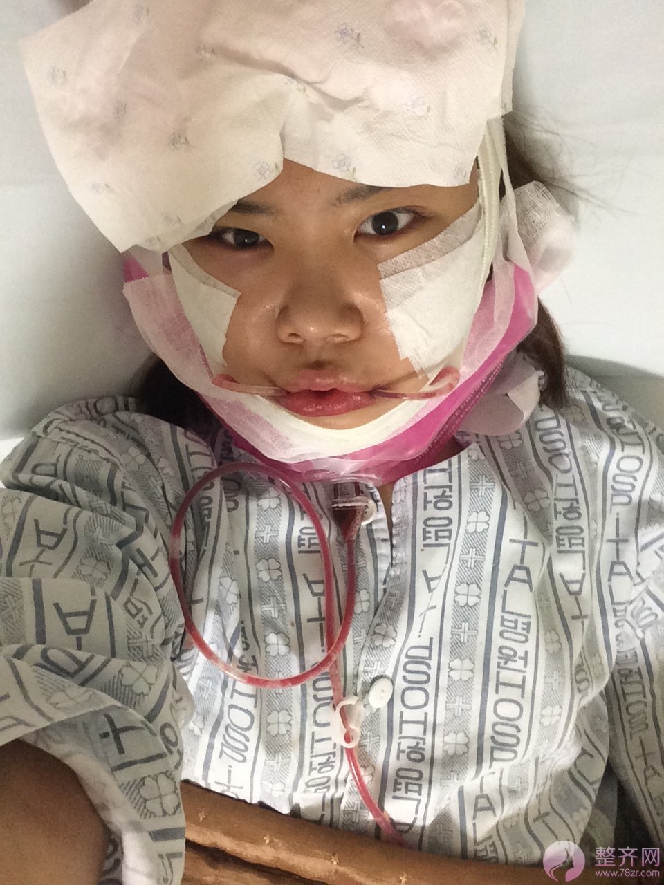 嘴边的有血的管子是引流管,轮廓手术都会需要插管的。