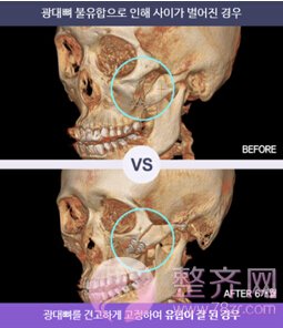 上面第一张的BEFORE照片是用钢丝来固定的案例,术后发生不愈合现象,由于不愈合导致颧骨外翻的情况。下面第二张的AFTER照片是,把之前的铁丝固定钉去掉,换成钛钉,进行修复手术后(双重固定)6个月的样子。