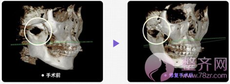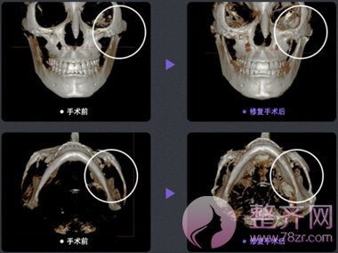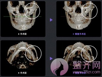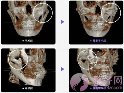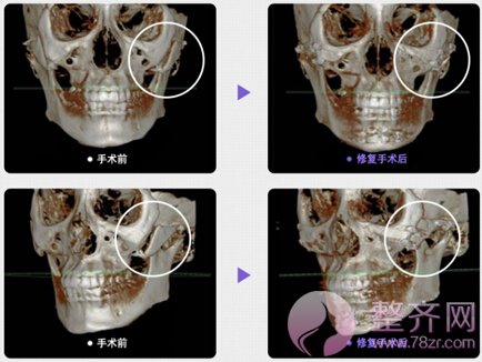上面一张是颧骨手术后侧面颧骨裂开, 左右不对称严重情况下进行修复手术术前后效果对比pic。