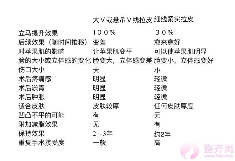 大或是悬吊虽然有不错的效果,但并不是适用于所有的面部状况,一般来说,拉皮术的立即效果虽好,但却有其他的缺点:伤口大、手术疼痛感、易有瘀青,恢复时间长,非悬吊的皮肤松弛下滑的状况相对比悬吊,对于皮厚度较薄的人效果差,易有凹凸不平的情形。细线紧实拉皮术后,我们可以避免拉皮的问题,伤口小、瘀青少、恢复时间短,对于皮肤厚薄没有限制,不用担心线材吸收后拉力变小,效果不如刚做的效果,细线紧实的问题是不如有立马的效果,但随着时间推移,效果会愈来愈好,而且附带减脂效果,可以让脸变得更小。