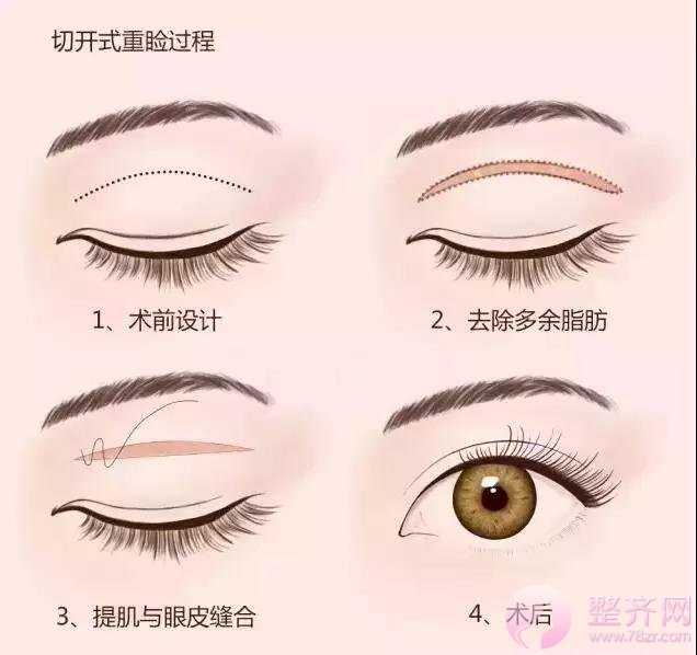 切开法是在上睑皮肤和睑板或上睑提肌腱膜之间选择恰当的位置切开,切除松弛的上睑皮肤与部分轮匝肌及过多的脂肪,并将皮肤切口缝合到睑板上缘的上睑提肌腱膜上,使其形成类似皱襞的疤痕粘连。